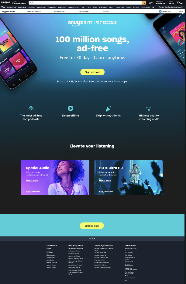 Net-new landing page for Amazon Music Unlimited aqusition messaging providing information and incentives offered specifically to Amazon Music customers. Focusing specifically on acquisition messaging and strategy in order to provide a fresh, and great first impression for prospective users.